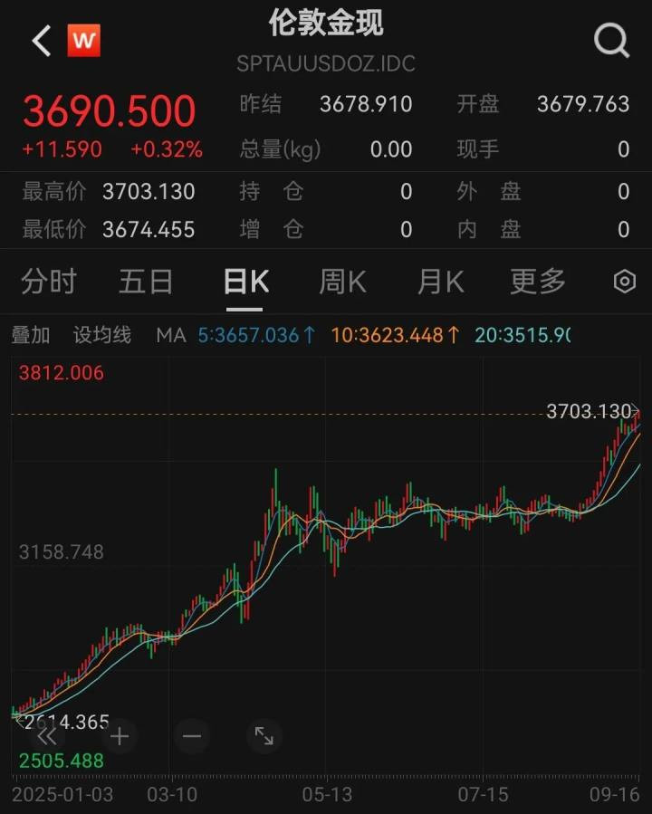9月16日,现货黄金盘中再创历史新高,最高触及3703.13美元/盎司,首次突破3700美元大关。全年累计大涨1076美元/盎司。