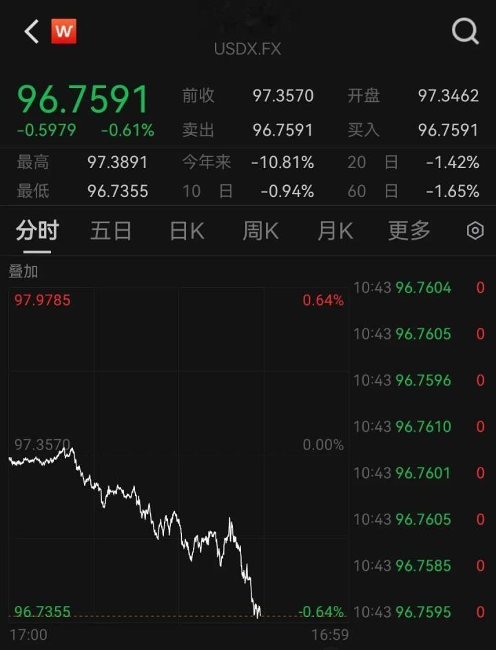 值得一提的是,美元指数盘中跌破97关口后继续走弱,截至发稿,报96.7591,跌幅为0.61%。
